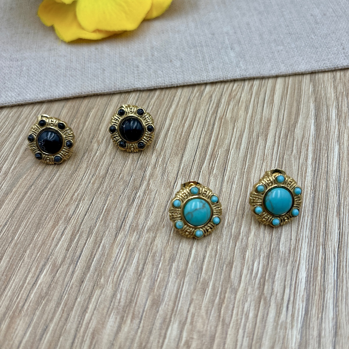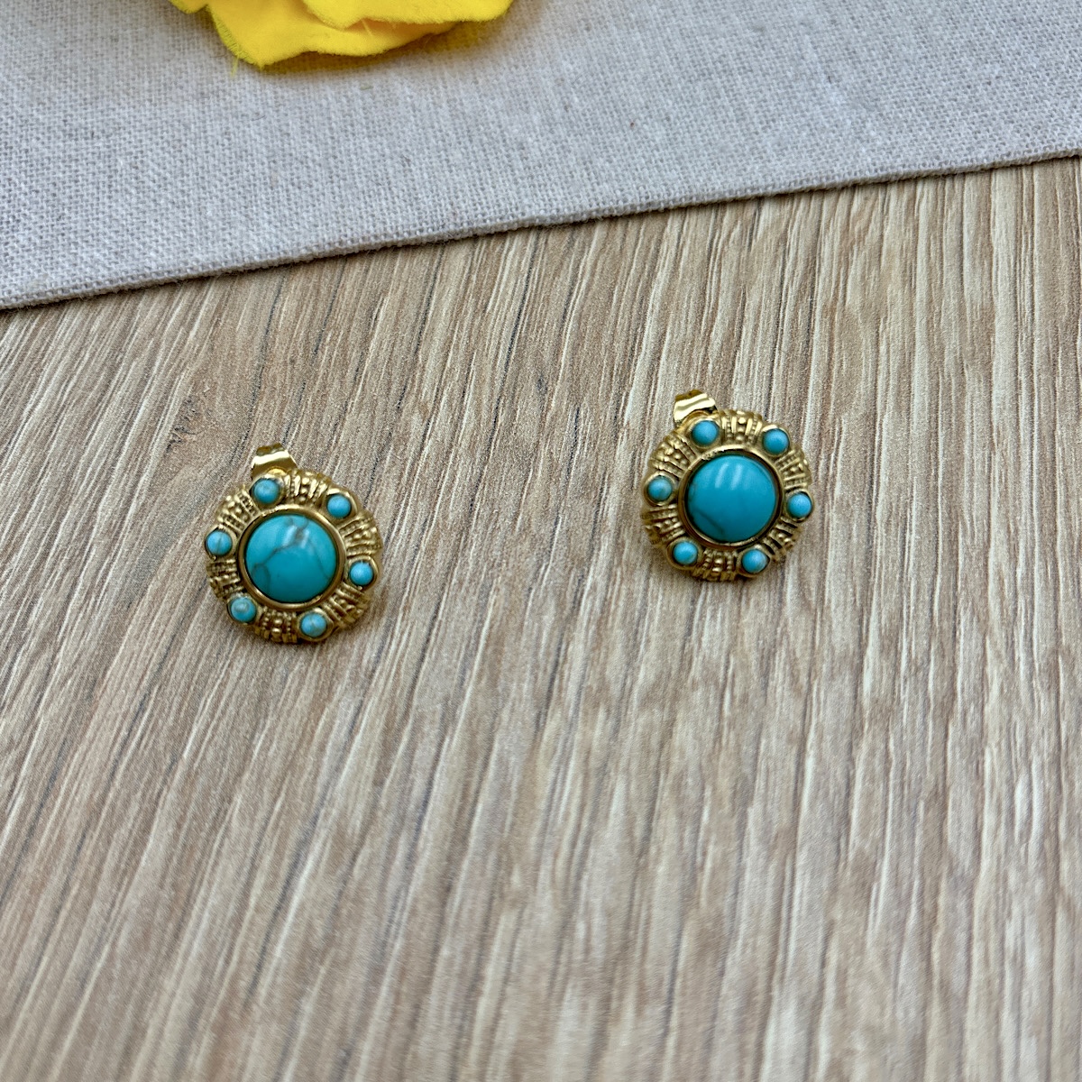 Ατσάλινα σκουλαρίκια με πέτρες τιρκουάζ σε χρυσή απόχρωση.