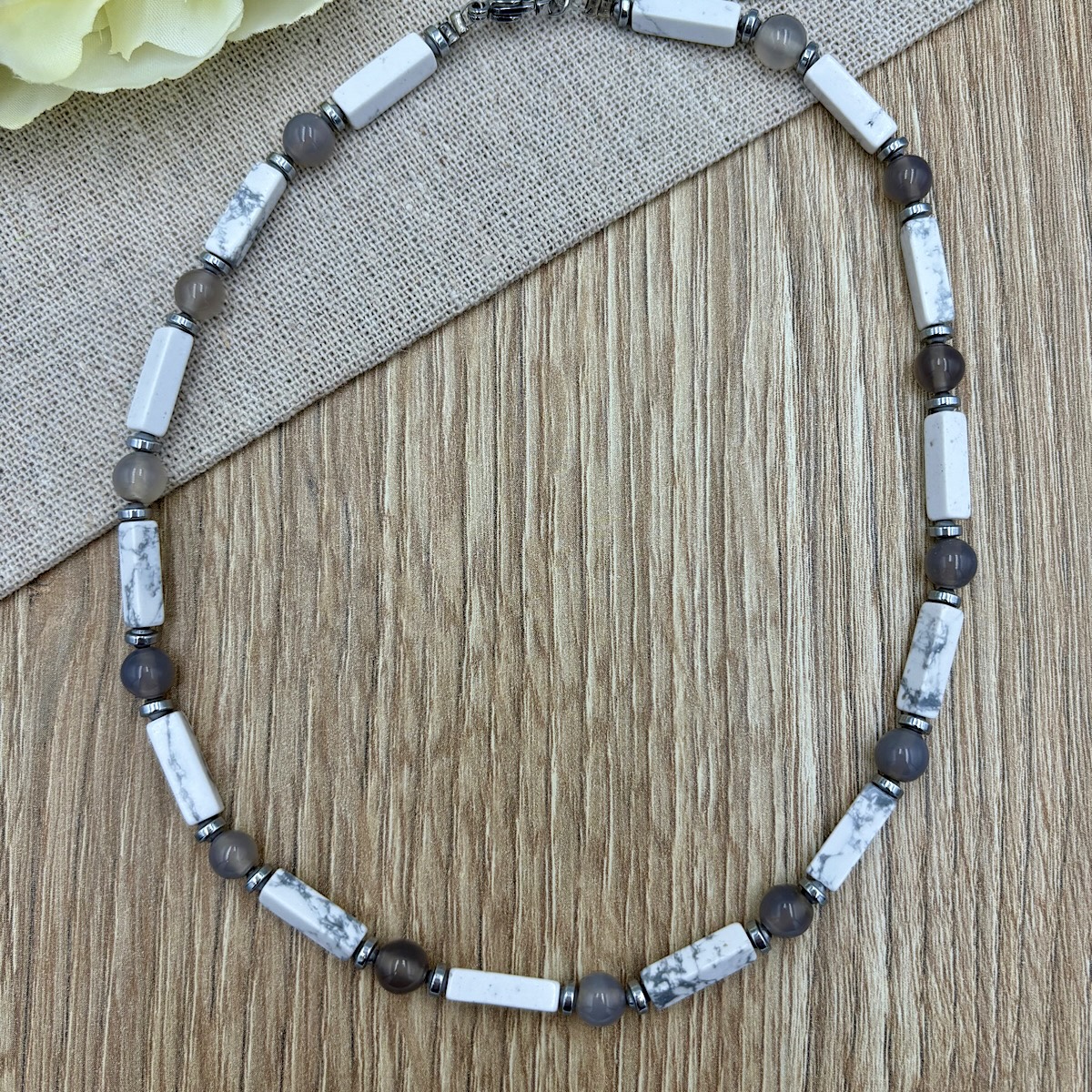 Κολιέ με παραλληλόγραμμες πέτρες χαολίτη σε λευκή με γκρι απόχρωση, γκρι αχάτες και αιματίτες.