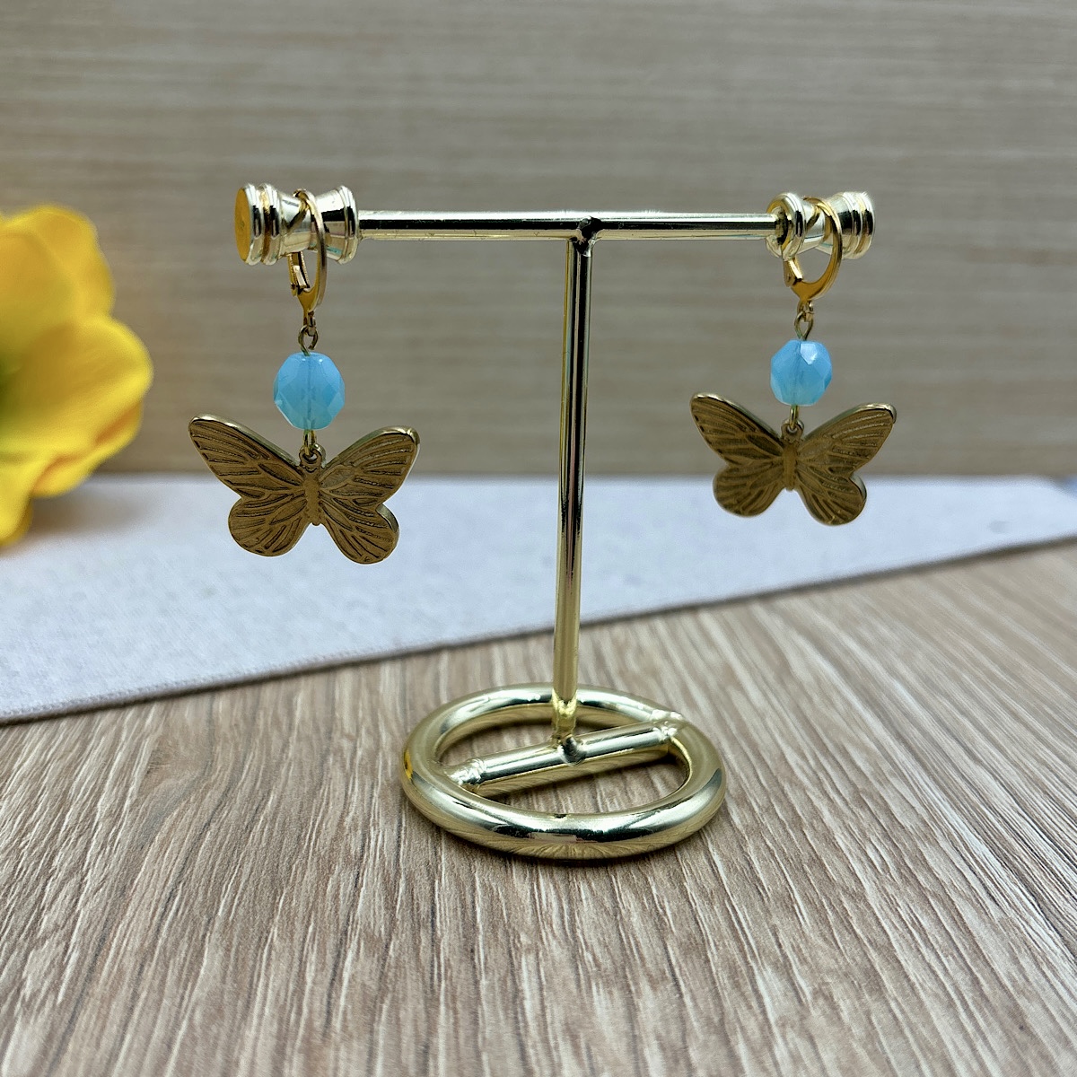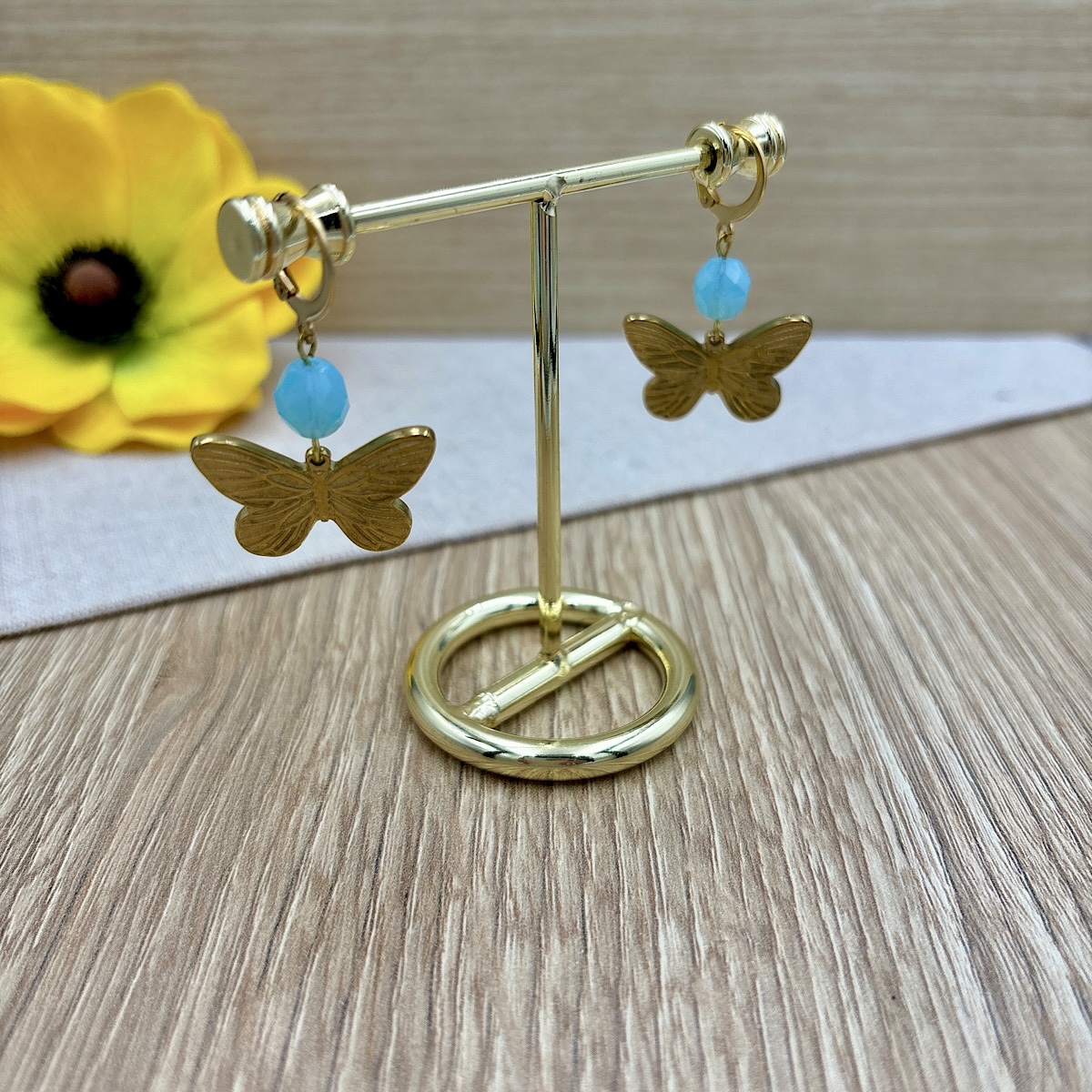 Σκουλαρίκια ατσάλινα με πεταλούδες επιχρυσωμένες και γαλάζια οπάλ κρύσταλλα.