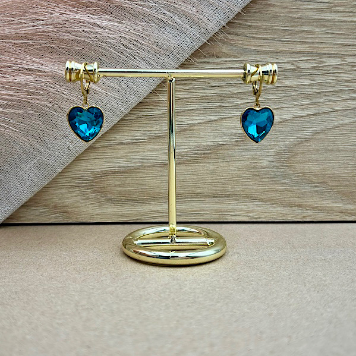 Σκουλαρίκια ατσάλινα καρδιά επιχρυσωμένα με μπλε κρύσταλλα.