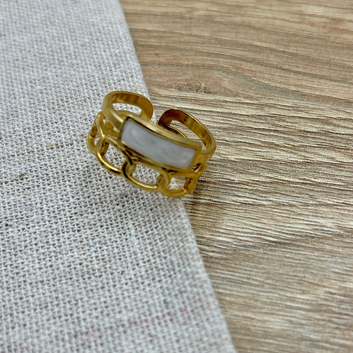 Δαχτυλίδι ατσάλινο διπλό με λευκό ιριδίζον σμάλτο επιχρυσωμένο.