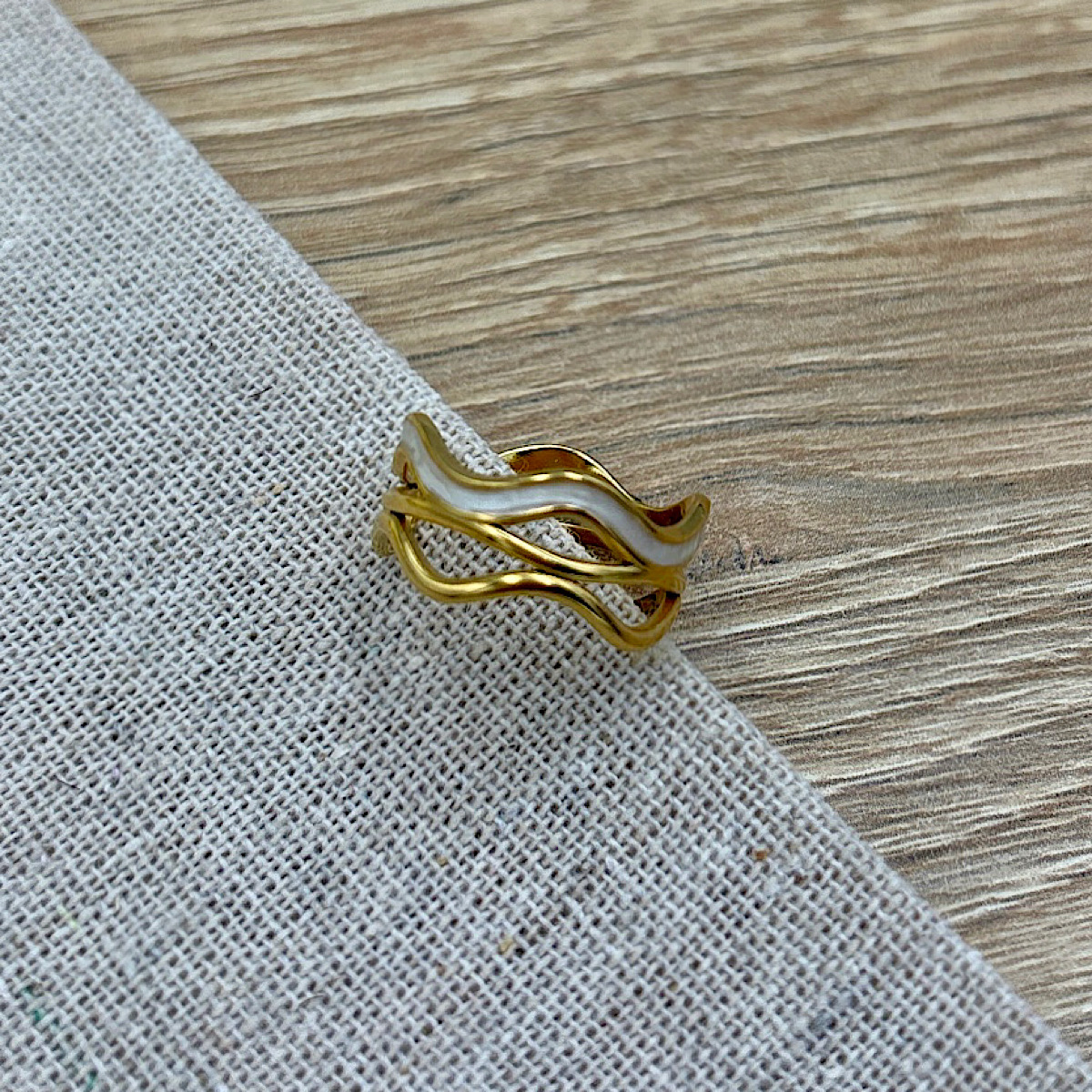 Δαχτυλίδι ατσάλινο κύμα με λευκό ιριδίζον σμάλτο επιχρυσωμένο.