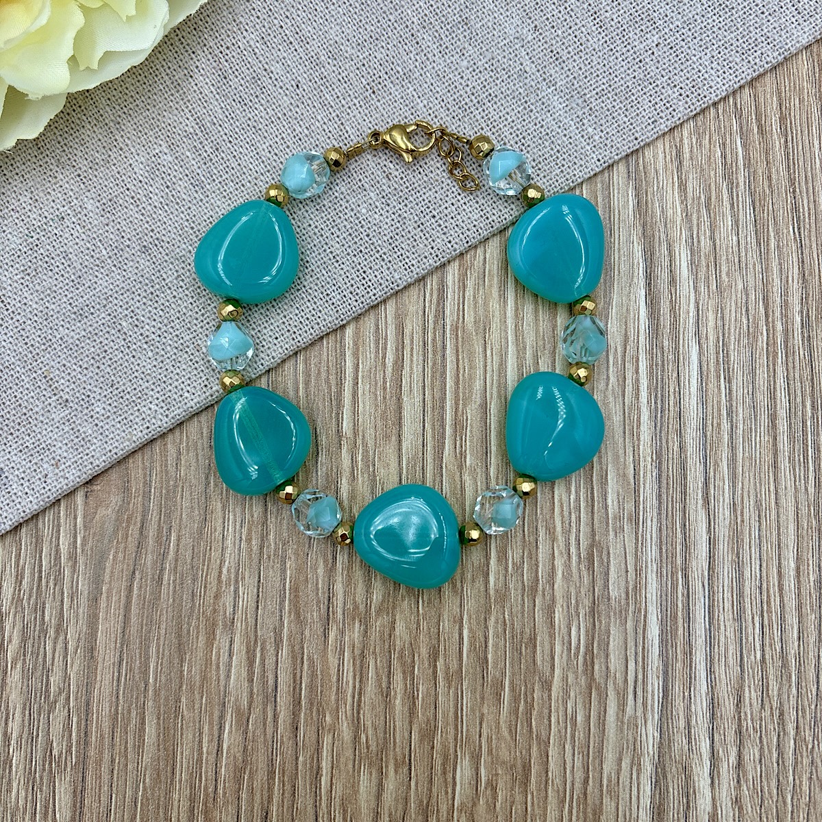 Βραχιόλι με κρύσταλλα οπαλίνες σε σχήμα βότσαλου σε πράσινη απόχρωση και αιματίτες χρυσούς.