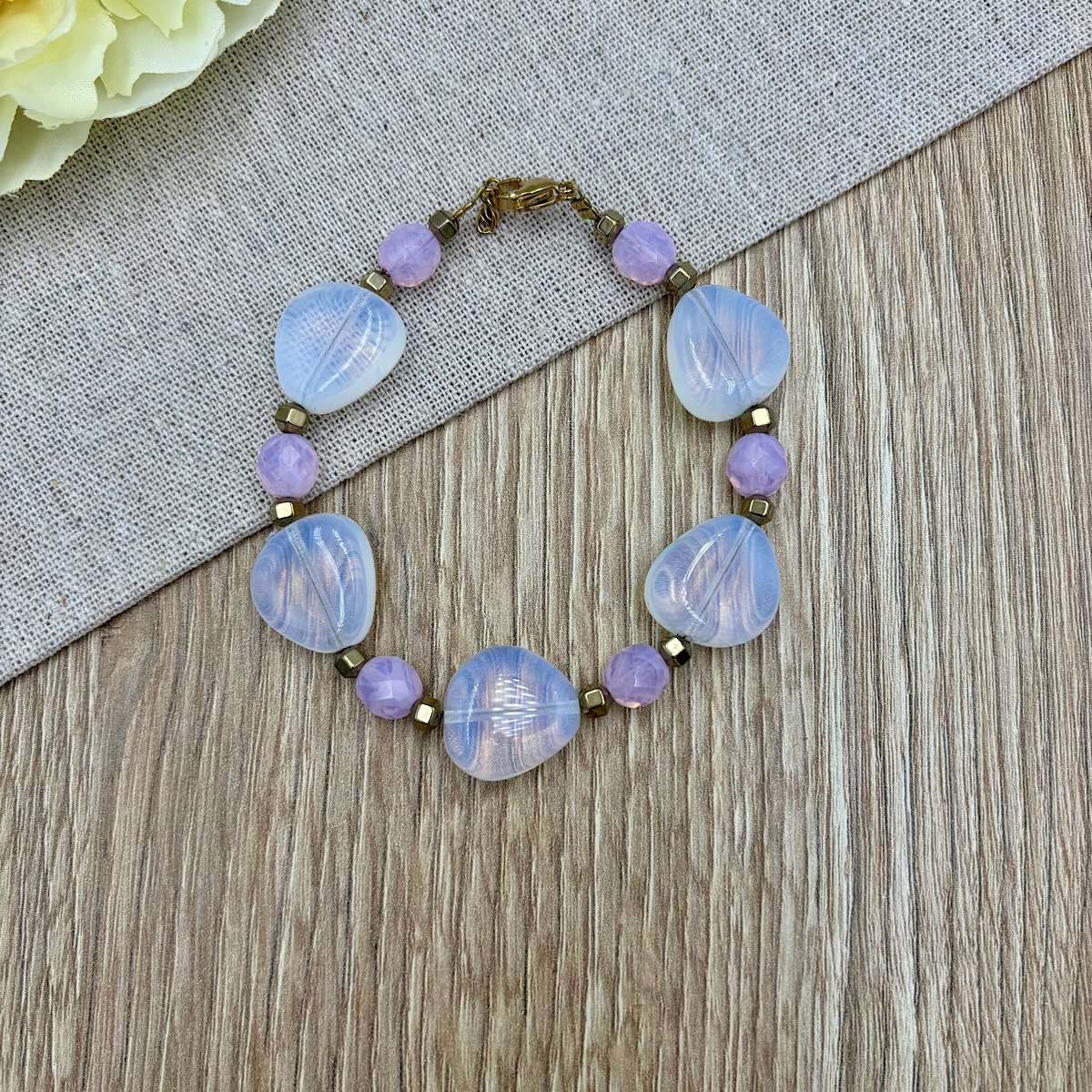Βραχιόλι με κρύσταλλα οπαλίνες σε σχήμα βότσαλου σε λευκή και ροζ απόχρωση και αιματίτες χρυσούς.