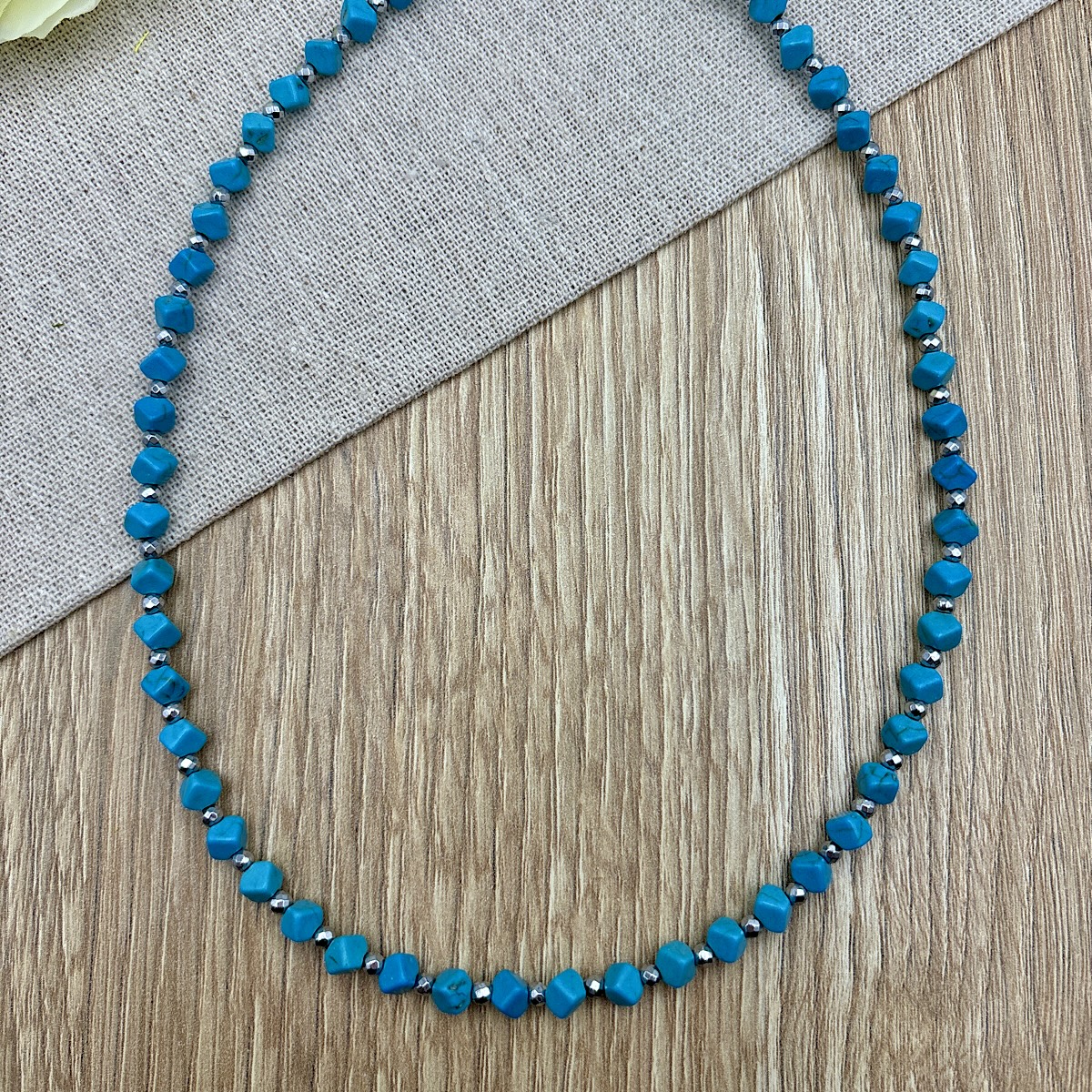 Κολιέ με ημιπολύτιμες πέτρες χαουλίτη και αιματίτη σε τιρκουάζ απόχρωση.
