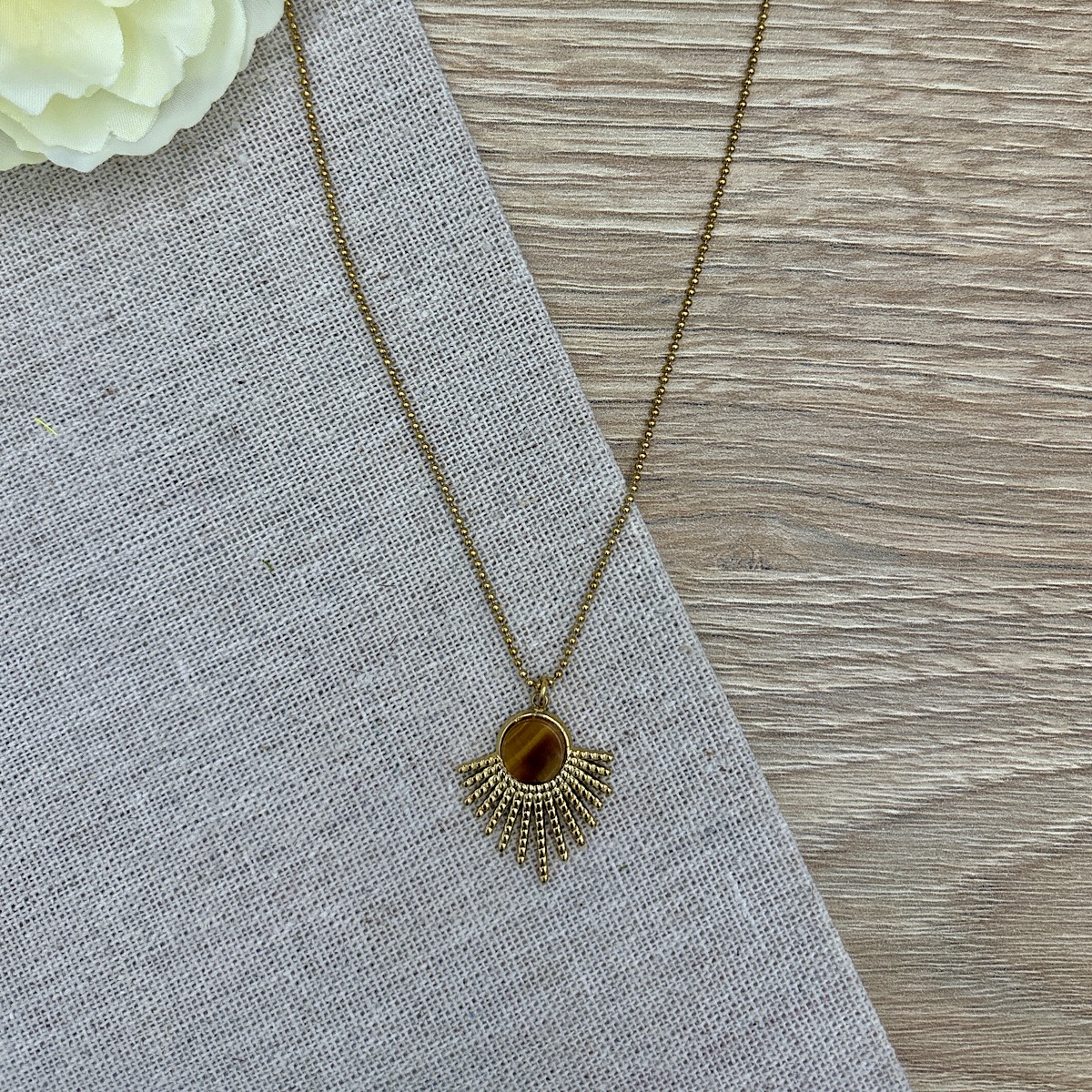 Κολιέ ατσάλινη αλυσίδα με στοιχείο μάτι της τίγρης σε καφέ απόχρωση.