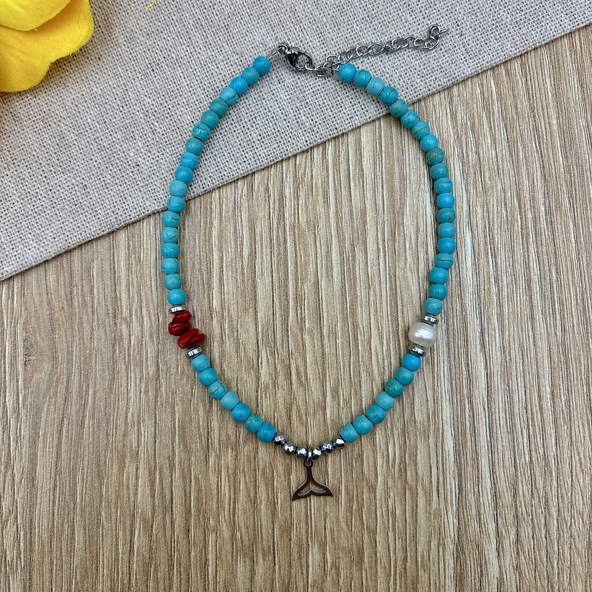 Βραχιόλι ποδιού με ημιπολύτιμες πέτρες χαουλίτη, τσιπς κοραλλιού, μαργαριτάρι και ασημί ατσάλινη ουρά.