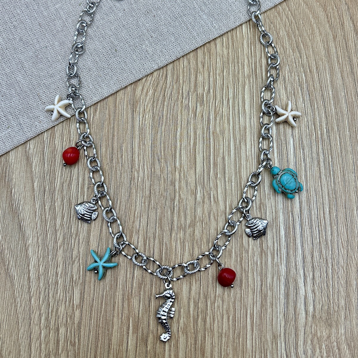 Κολιέ αλυσίδα ατσάλινη με καλοκαιρινά στοιχεία σε ασημί απόχρωση και ημιπολύτιμες πέτρες κοράλλια και χαολίτες.
