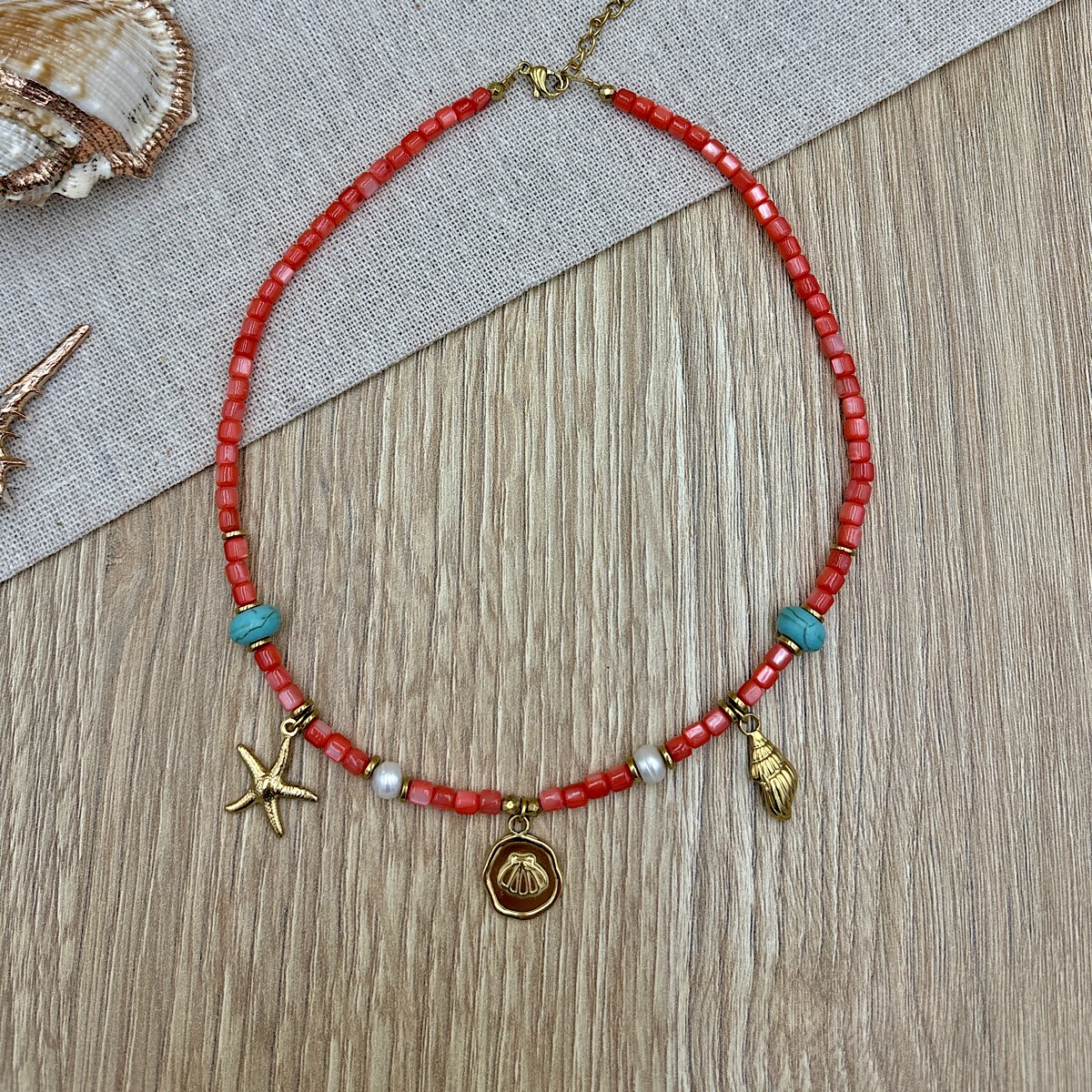 Κολιέ από φίλντισι σε κοραλί απόχρωση, ημιπολύτιμες πέτρες και κρεμαστά ατσάλινα στοιχεία επιχρυσωμένα.