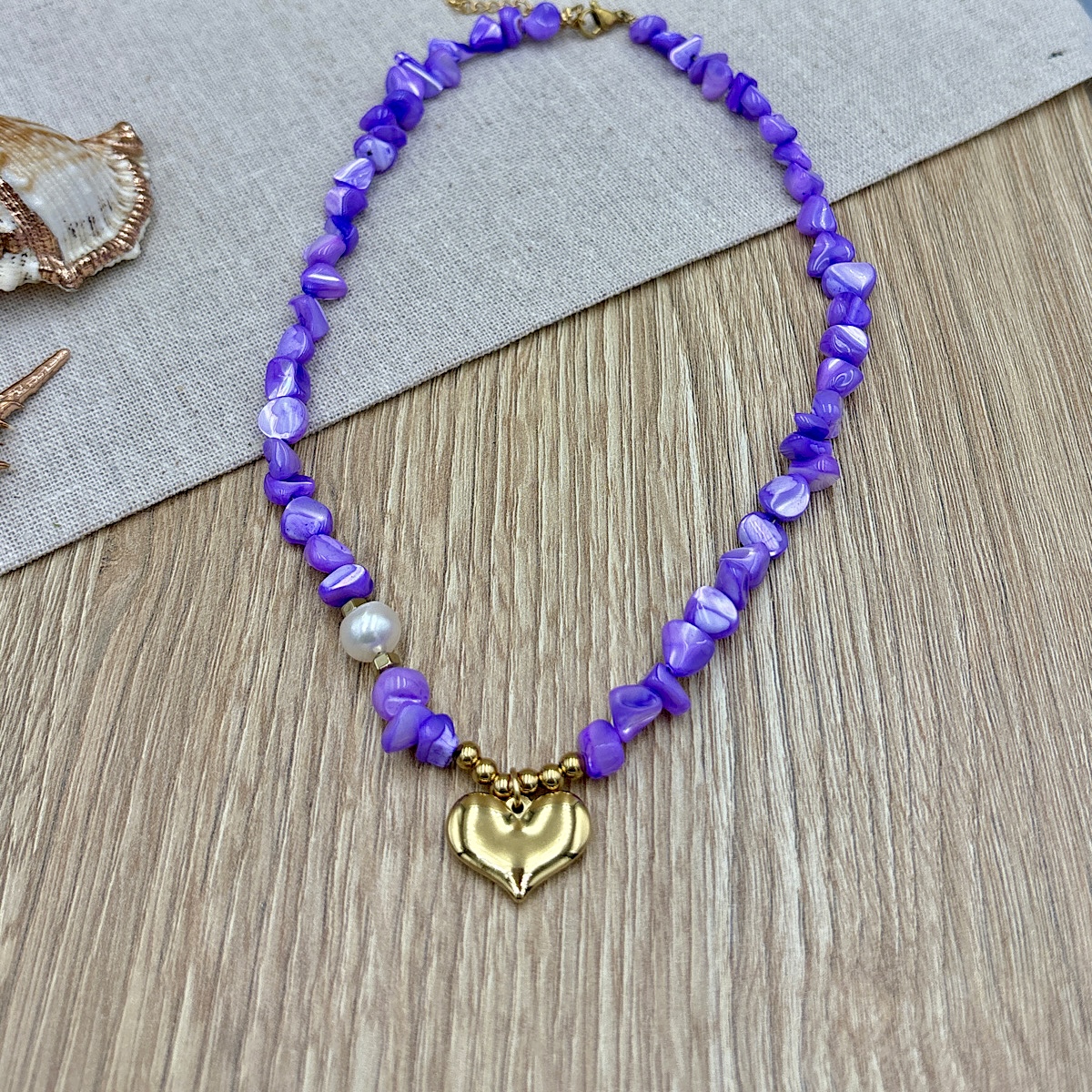 Κολιέ από πέτρες τσιπς μωβ, μαργαριτάρι και ατσάλινη επιχρυσωμένη καρδιά.